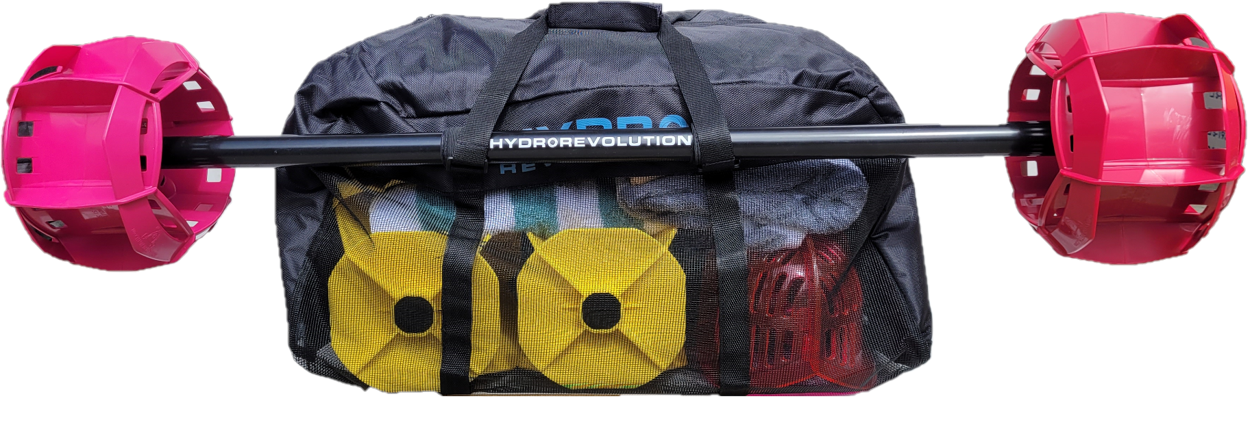 This Ventilated Duffle Bag is ideal for consumers and personal trainers. The Mesh Duffle can fit 3 sets of Bells and 3 sets of Fins. The ventilated mesh top allows for easier drying of equipment post workout. Built with high quality polyester and rubberized mesh for durability. Elastic Velcro Tabs to attach Barbell to outside of bag. Centered grab handles and shoulder strap for carrying options. Since the bottom of the bag is also mesh, you should not drag this bag across the ground.